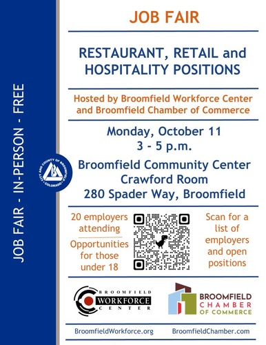 Industry specific job fair to help you land a position in a retail, hospitality, restaurant, and/or seasonal opportunity. 20 vendors want to meet you. Keep an eye on www.BroomfieldWorkforce.org for attending employers. Perfect for young adults too.