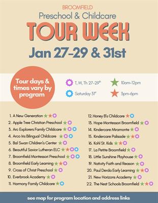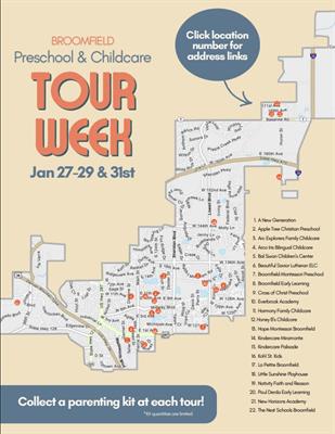 This event will showcase licensed, high quality child care sites for families to explore for child care and Universal Preschool openings. There is a variety of facilities to explore including: family child care homes, preschools, child care centers. High quality child care in Broomfield is available for infants, toddlers and preschoolers that will support them with foundational skills to be Kindergarten ready!