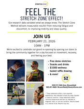 To celebrate the launch of our research study validating the Stretch Zone Effect we are having a Grand Reopening this Sat, Feb 21 from 10-1. We will have snacks and drinks (pancakes and bacon donated by Snooze!!), free demo stretches, and a drawing for a wellness basket worth over $1000! Hope to see you there!
